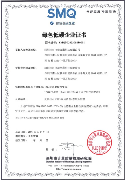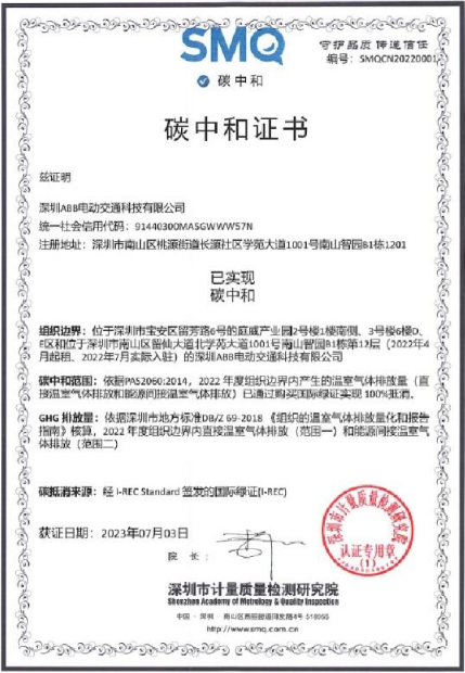 Recently, Shenzhen ABB Electric Transportation Technology Co., Ltd. was awarded the “Carbon Neutrality Certificate” and “Green and Low Carbon Enterprise Certificate” by the Shenzhen Institute of Metrology and Quality Testing, fully demonstrating its mission to actively respond to climate change, fulfill corporate social responsibility, and empower it to achieve a zero emission future through its own actions.